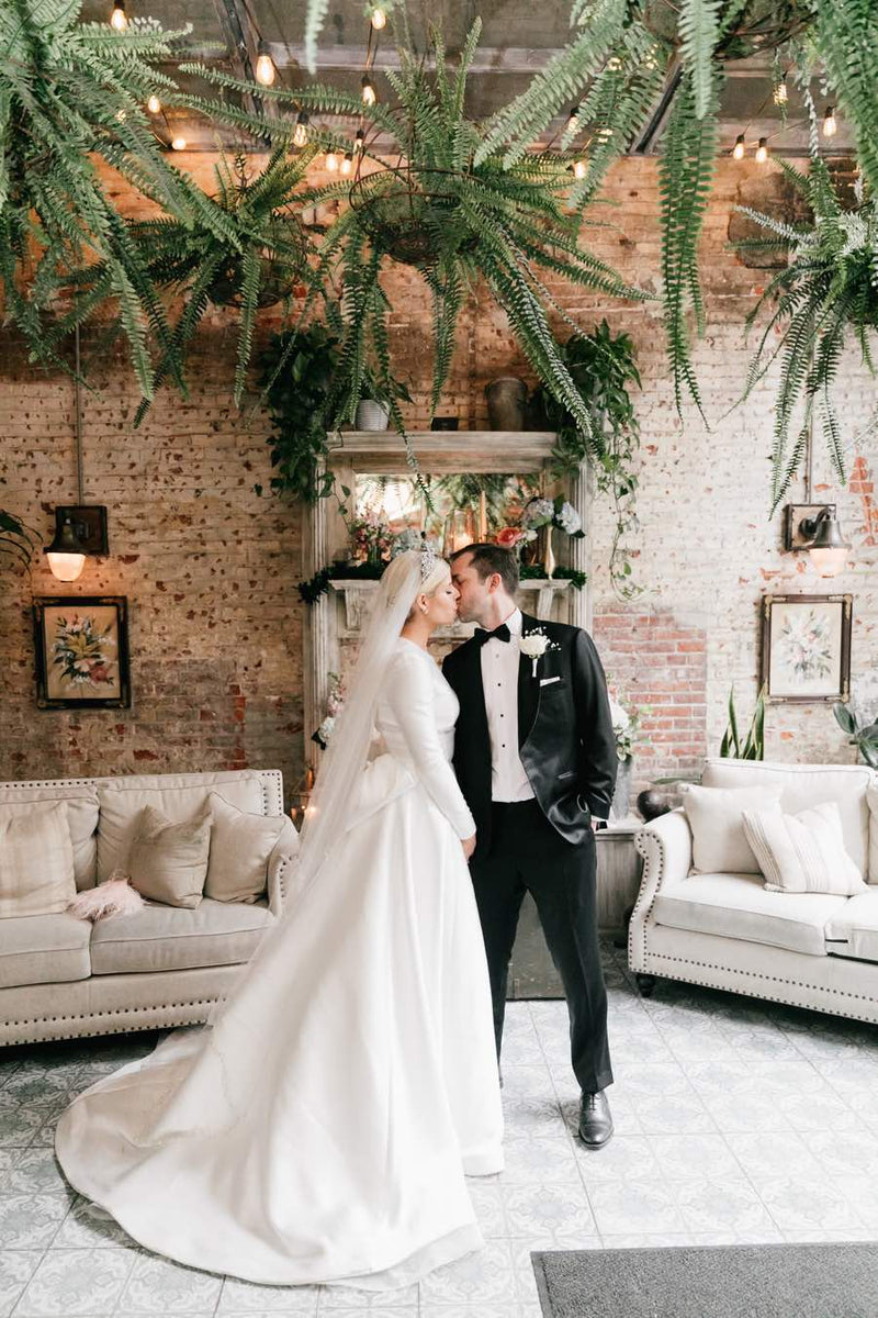 Our gorgeous bride Emily stunned in Reem Acra at her Philly wedding to husband Colin. They got married at restaurant Harp & Crown and made sure it was a party with delicious food, drinks, and sweets! Check out the entire feature here to get more photos and details from their big day!