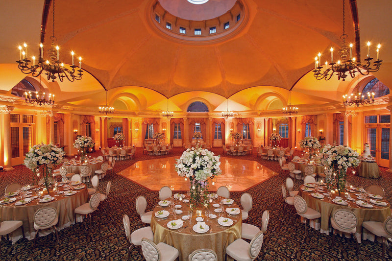 Entering the classically-designed Grand Ballroom inspires awe as the splendor of the space is revealed. It’s immense vaulted ceiling spans the rotunda, and after reaching sublime heights, is capped by a marvelous glass dome. Richly paneled in damask, the walls, when bathed in light, create a marvelously warm environment that makes even a party of 350 guests feel like an intimate affair.