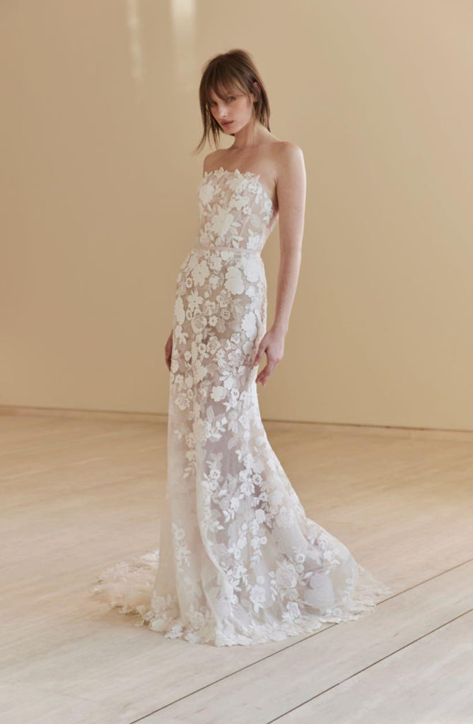 Previous Product Next ProductStyle Fia: Strapless slim-fitted gown crafted from sheer, embroidered tulle, adorned with cascading 3D floral appliqués that sculpt the body with romantic texture.