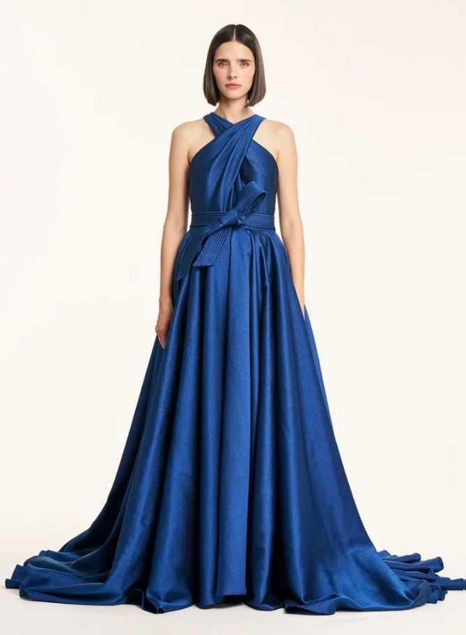 Style 1619: Satin Criss-Cross Gown & Trapunto Belt.