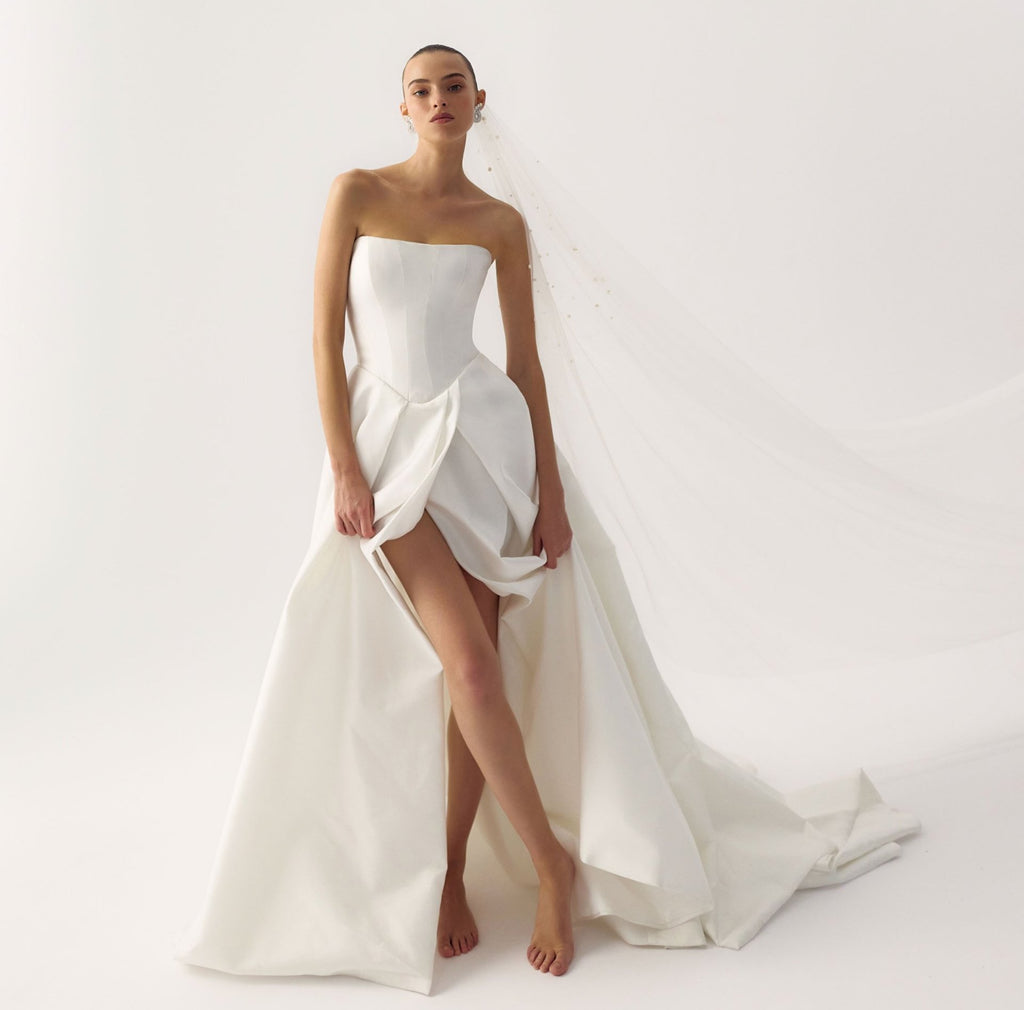 Style Layla: Silk mikado gown with structured strapless bodice, boat neckline, basque waist, button-back closure and voluminous pleated skirt with leg slit and dramatic train.