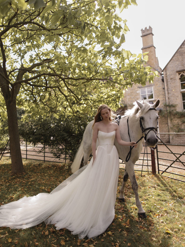 Style Milla: A-line gown featuring a strapless Victorian-style silk Mikado bodice with a boat neckline. The skirt boasts layers of ethereal tulle. The back features fabric buttons and a soft long train.