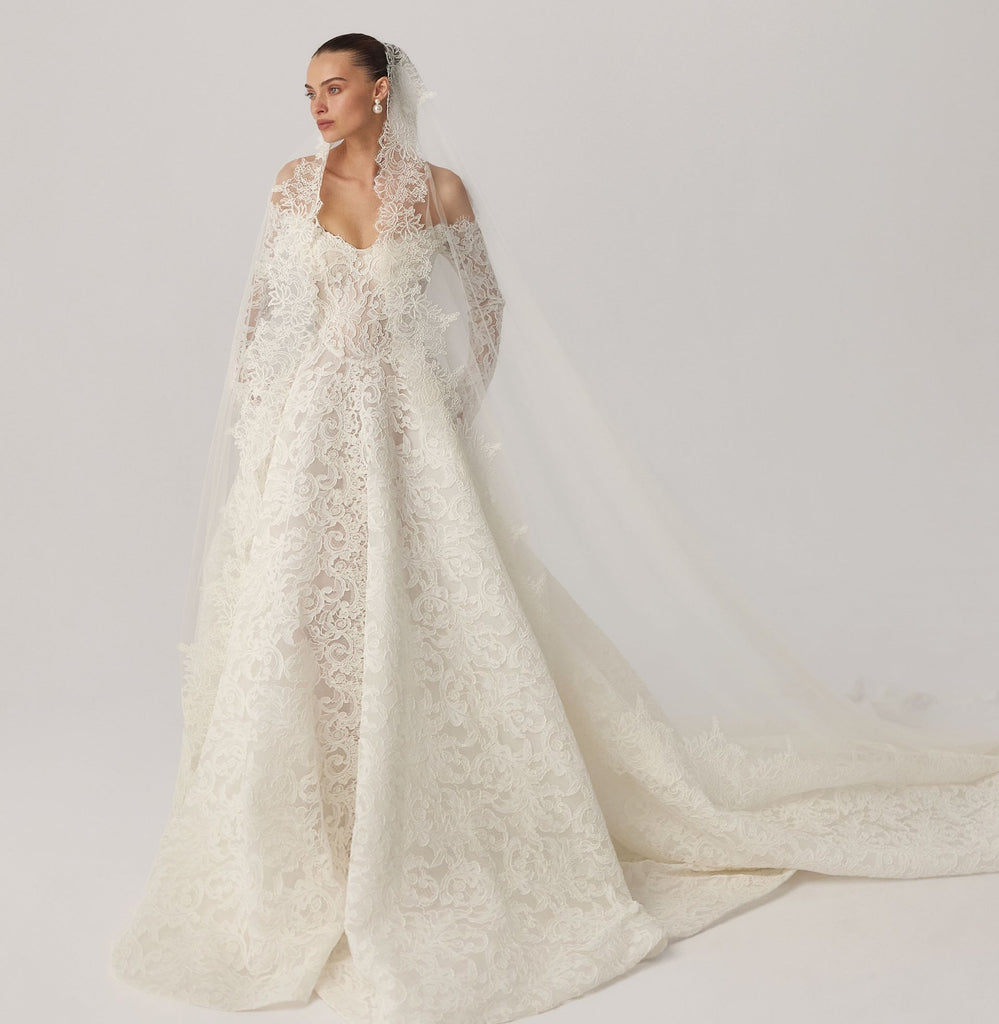 Style Sophia: Romantic A-line made of intricate soutache floral lace featuring delicate off-shoulder long sleeves and a sweetheart neckline with structured bodice, full skirt and cathedral length train.