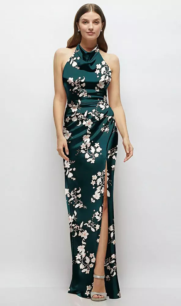 Style LB060FP- Cowl halter, open-back floral satin maxi dress by Lovely by Dessy Collection