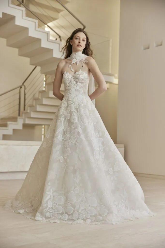 Style Joy: n ethereal sweetheart strapless A-line gown, lace base fabric with floral appliqués.